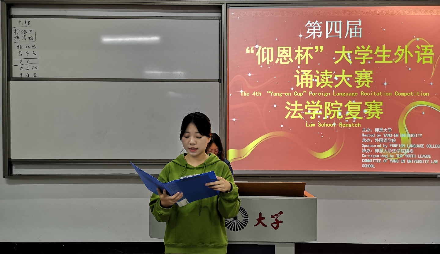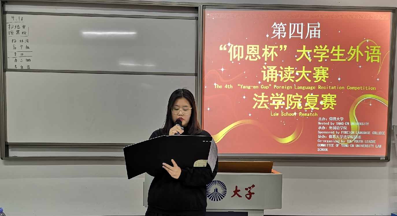 4月18日晚,由仰恩大学主办,外国语学院承办,2026世界杯官方合作网站团委协办的第四届“仰恩杯”大学生外语诵读大赛2026世界杯官方合作网站复赛于仰恩大学第三教学区普照楼204举行。外国语学院老师陈苗苗,梁正长担任本次比赛评委,2026世界杯官方合作网站17级、18级学生参加了此次活动。