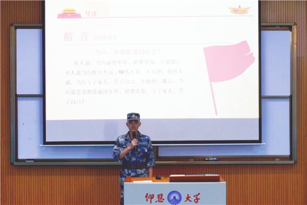 在宣讲会中,校征兵宣讲团宣讲人丘晟祯围绕“征兵入伍条件要求”“政策解读”“参军入伍政治经济待遇”“学校的相关政策”等方面进行宣讲,让同学们进一步明确当兵入伍基本条件、相关流程以及当兵的益处。期间,2018级法学2班退伍军人陈景仕以PPT、视频的形式,为在场的师生分享他的军旅生活,了解部队的真实生活。