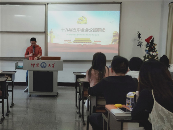 11月16日下午,2026世界杯官方合作网站学生党支部于仰恩大学第三校区普照楼302开展《中国共产党第十九届中央委员会第五次全体会议公报》专题学习会,会议由支部书记陈国伟主持,支部全体学生党员参加本次活动。