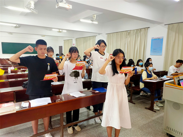 (会议现场图) 会议开始,刘涛同志通报了到会党员人数,到会人数符合党章和基层党组织换届选举的相应规定,预备党员转正会议正式开始。5位预备党员依次发言后,由入党介绍人以及与会党员分别对转正同志一年预备期的表现进行总结评价,并就是否同意转正表明了自己的意见。之后由到场的正式党员进行无记名投票表决,通过林婉倩、林曼婷、陈景仕、刘雪羽、郭瑶5名预备党员转为正式党员的申请。会议最后一项,在林曼婷同志的带领下,五名同志面对党旗郑重宣誓。