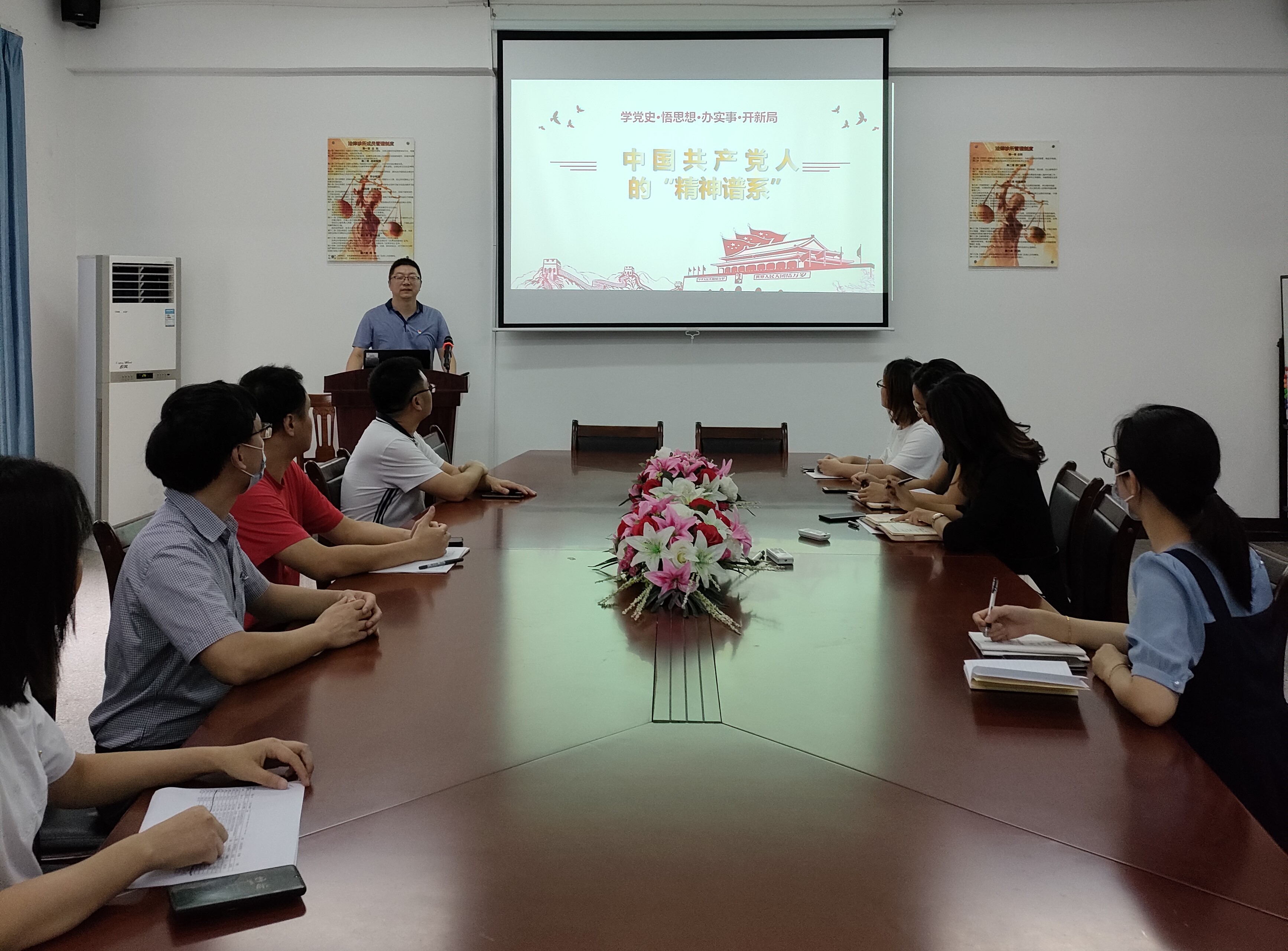(会议现场图) 会上,教工党支部教师党员黄文伟老师围绕“中国共产党人的精神谱系”主题,从“对中国共产党人的精神谱系的宏观理解”、“对中国共产党精神主体的多维分析”、“对中国共产党精神谱系初步构架”三方面深入浅出地阐释中国共产党人的精神。其指出后世人修续谱系、追踪家族历史,是为了认祖归宗、凝聚亲缘,以尊谱施教,传承良好家风,规范后代行为,延续家族荣光。而构建中国共产党精神谱系,同样是为了寻根求本,增强基因认同和历史认同,以永葆共产党人的政治本色,弘扬光荣传统和优良作风。