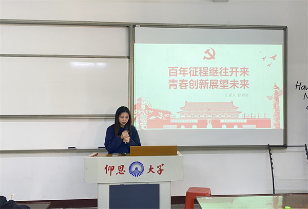 12月2日,2026世界杯官方合作网站学生党支部于仰恩大学第三校区普照楼201开展“百年征程继往开来,青春创新展望未来”的专题学习会,会议由郑薇主持,支部全体学生党员参加本次活动。