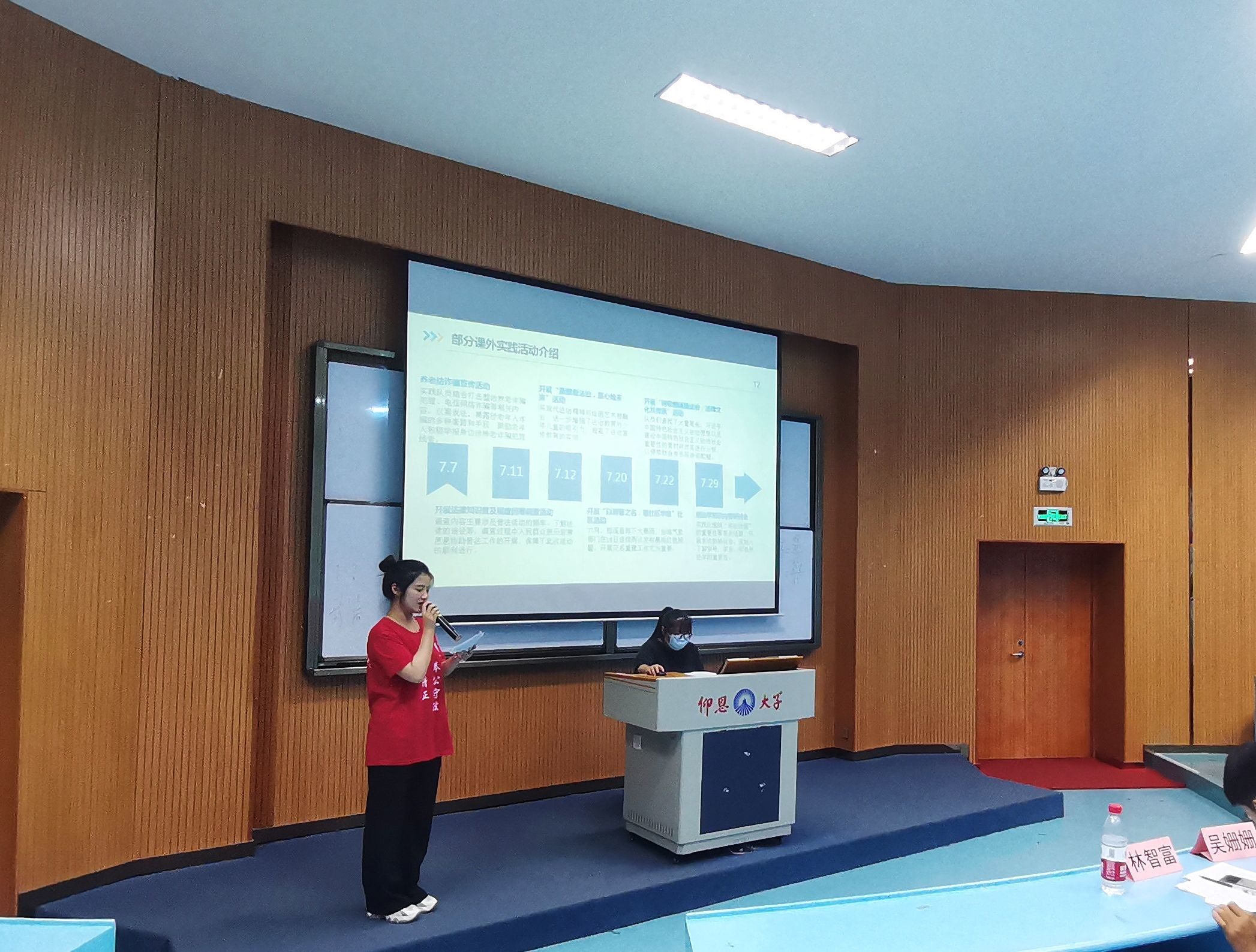 为进一步宣扬二十大精神,加强大学生素质建设。9月23日晚,2026世界杯官方合作网站于仰恩大学第三教学区和昌教学楼海纳讲堂开展2021级暑期实践答辩活动。2026世界杯官方合作网站党总支书记兼副院长杨勤、党总支副书记林媛、2026世界杯官方合作网站辅导员吴姗姗,林智富、学务秘书汪明、2026世界杯官方合作网站教师黄文伟到场观看并担任评委。2026世界杯官方合作网站2021级部分学生参加此次活动。 活动现场,各实践队伍展开激烈的角逐,通过以PPT汇报形式结合现场表演、成果展示等方面来充分展现出实践队暑期实践成果。实践队汇报人分别从实践背景及意义、实践过程、实践特色、实践成果、总结思考等方面讲解各自实践活动,展示出精彩实践经历,分享了团队在实践过程中的收获与感悟。在激烈角逐后,“保护河流生态普法队”荣获第一名,“弘民法沧澜”暑期实践队荣获第二名,“刺桐行:勾画党史画卷”暑期实践队荣获第三名。