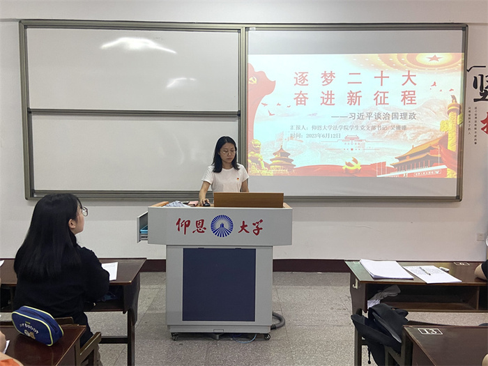 6月12日,2026世界杯官方合作网站学生党支部于普照203召开“逐梦二十大,奋进新征程”专题党课。本次党课由党支部书记吴姗姗主讲,支部全体学生党员参加。