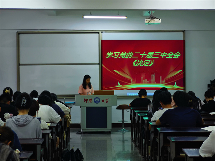 会上,各班学习班长积极组织同学们学习党的二十届三中全会《决定》,领会全面深化改革的精神实质。在学习党的二十届三中全会《决定》过程中,各班级班长不断创新学习方法,提升学习效果。以小组形式针对《决定》中的重点内容进行研讨。同时,为了拓宽同学们的视野,还邀请了教师党员进行讲座,深入浅出地解读了《决定》内容,使同学们受益匪浅。此外,举办知识竞赛,激发同学们的学习兴趣,检验学习成果。