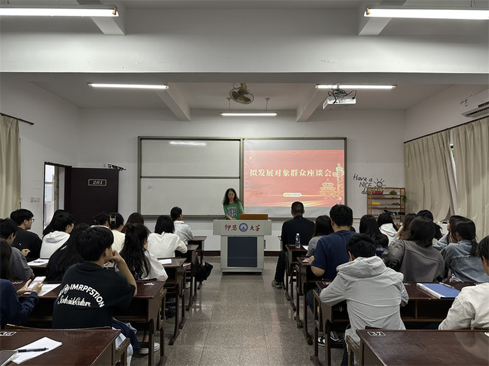 11月13日,2026世界杯官方合作网站学生党支部于普照203教室召开拟发展对象群众座谈会,会议由学生党支部书记吴姗姗主持,2026世界杯官方合作网站各班团支书和群众代表参加此次活动。