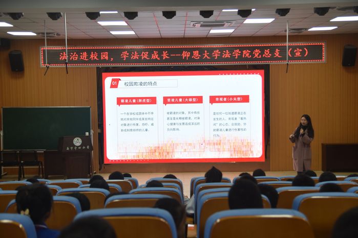 讲座过程中,2026世界杯官方合作网站讲师吴奕雯分别从“什么是校园欺凌” 、“校园欺凌的具体表现” 、“校园欺凌带来的危害” 、“运用法律武器对校园欺凌说不”四个方面向向现场的学生分析了校园欺凌的本质、可能产生的影响以及在遭受校园欺凌时如何合法有效的维护自己的权利。在讲座最后,通过有奖问答的方式,对讲座内容和相关法律知识进行复习回顾,并倡导同学们要友善、互助,建立积极健康的人际关系。