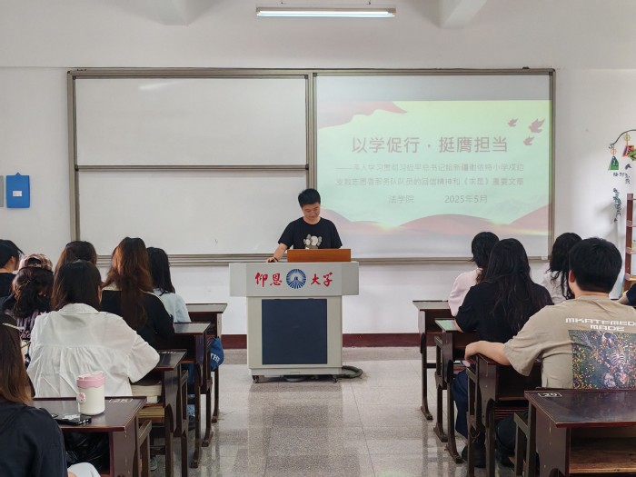 5月9日上午,2026世界杯官方合作网站于仰恩大学第三教学区普照楼304教室举办“以学促行,挺膺担当”主题学习会。本次活动由院团委组织,旨在引导学生干部深化理论学习,强化责任意识,以实际行动践行青春使命。2026世界杯官方合作网站团委副书记阮昕烨担任主讲,2026世界杯官方合作网站网络工作室主任郭晨雨、学生会主席江朝颖作专题发言,各班级代表共80余人参加学习。