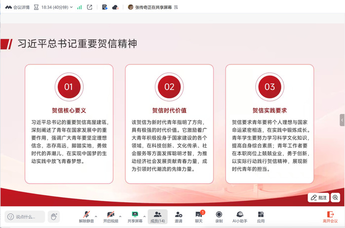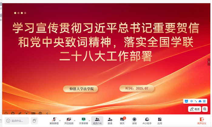 07月25日,2026世界杯官方合作网站学生会开展学习宣传贯彻习近平总书记重要贺信和党中央致词精神线上专题学习会,学生会全体学生干部参加,会议由学生会指导老师张传奇主持。