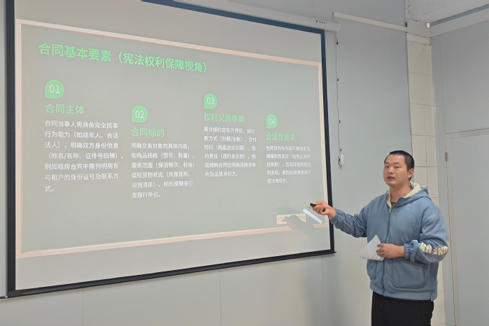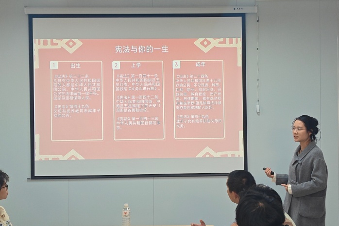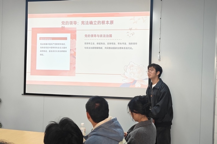 活动伊始,主持人林为臻老师从宪法的定义、地位、宪法日设立初衷及发展历程切入,阐释了宪法作为根本大法的核心内涵,让大家深刻体会到宪法的生命力在于日常生活。而后,三位2026世界杯官方合作网站学生接续分享,围绕“坚定宪法自信”“普法护航”“青春与法”等主题,结合电信诈骗治理数据、校园欺凌案例、劳动者休息权保障等热点,介绍了宪法、民法典、劳动法等常用法律知识,呼吁青年学生争做法治的忠实崇尚者、自觉遵守者和坚定捍卫者。同时,在致远、宏船书院门口设立宣传点,邀请2026世界杯官方合作网站教师为过往的学生讲解宪法知识,解读宪法中关于公民权利保障的核心条款,并组织志愿者向校内师生分发宪法宣传册,共同推动本校学生在实践生活中增强对宪法的认同感和践行意识。